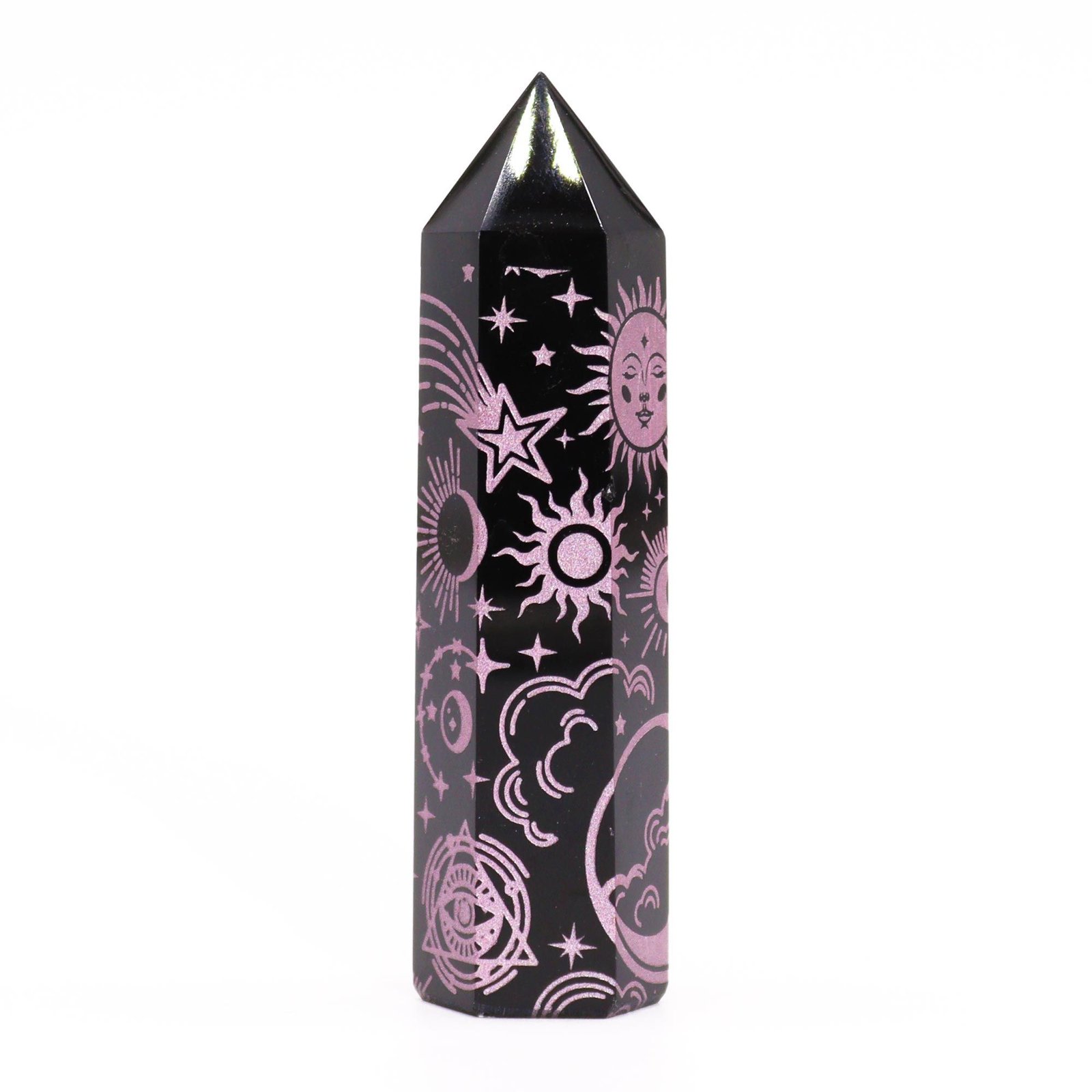 Introduce a touch of elegance and mystical energy to your collection with Black Obsidian Points, featuring delicate rose pink celestial designs. These points, each weighing around 60-70 grams and measuring 9 cm in height, combine powerful metaphysical properties with a charming aesthetic.