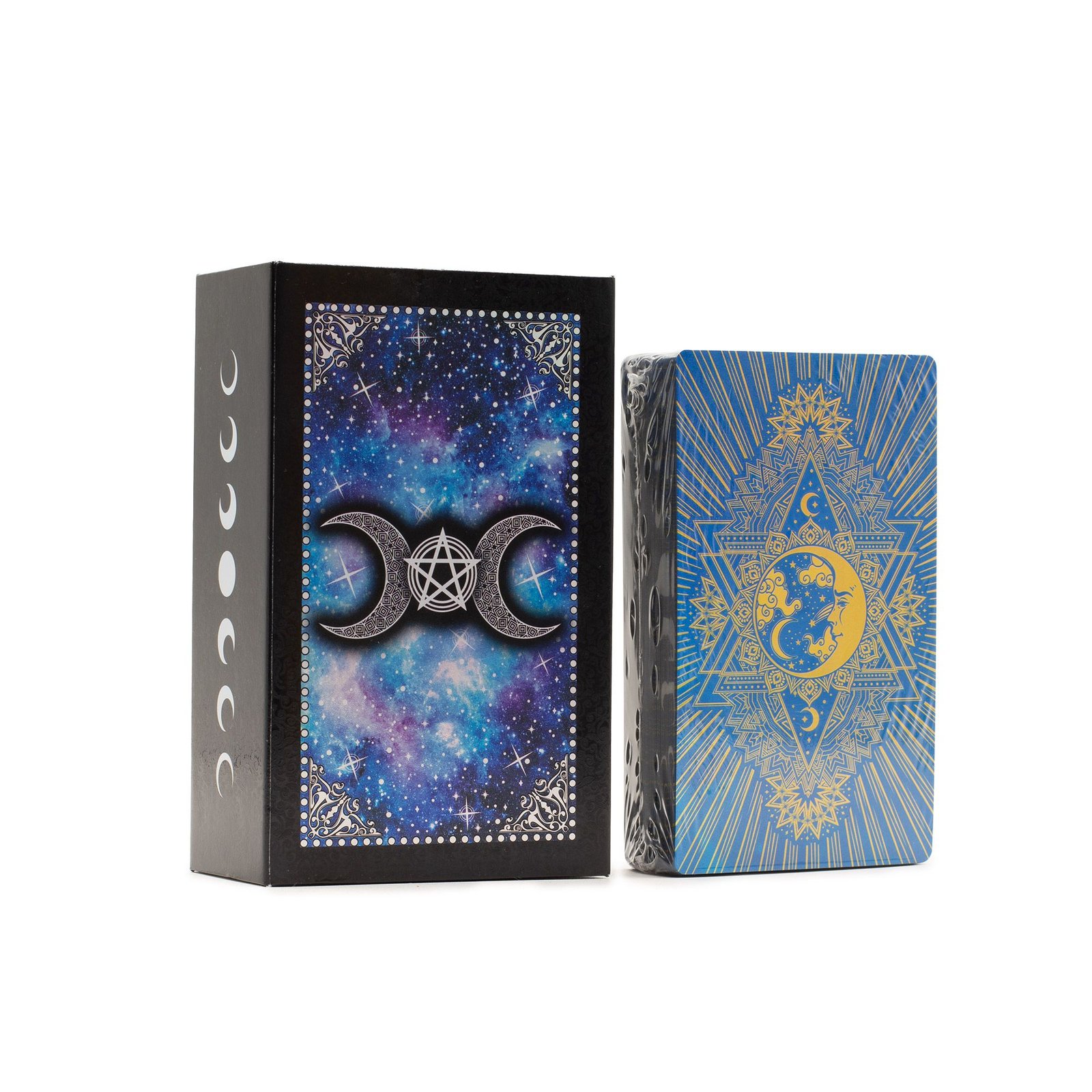 Celestial, calm, and visually captivating, the Moon Face tarot set draws on lunar symbolism and cosmic imagery. Blue foil accents shimmer against a star-filled design, giving this deck a serene yet magical presence.