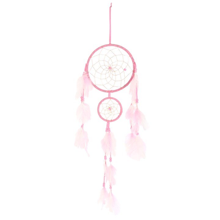 This vibrant dreamcatcher features 2 light pink hoops and webs dotted with pink beads. Feather tassels finish off this fun and playful style and is sure to add a pop of colour to your decor. Approximately 80cm total length.