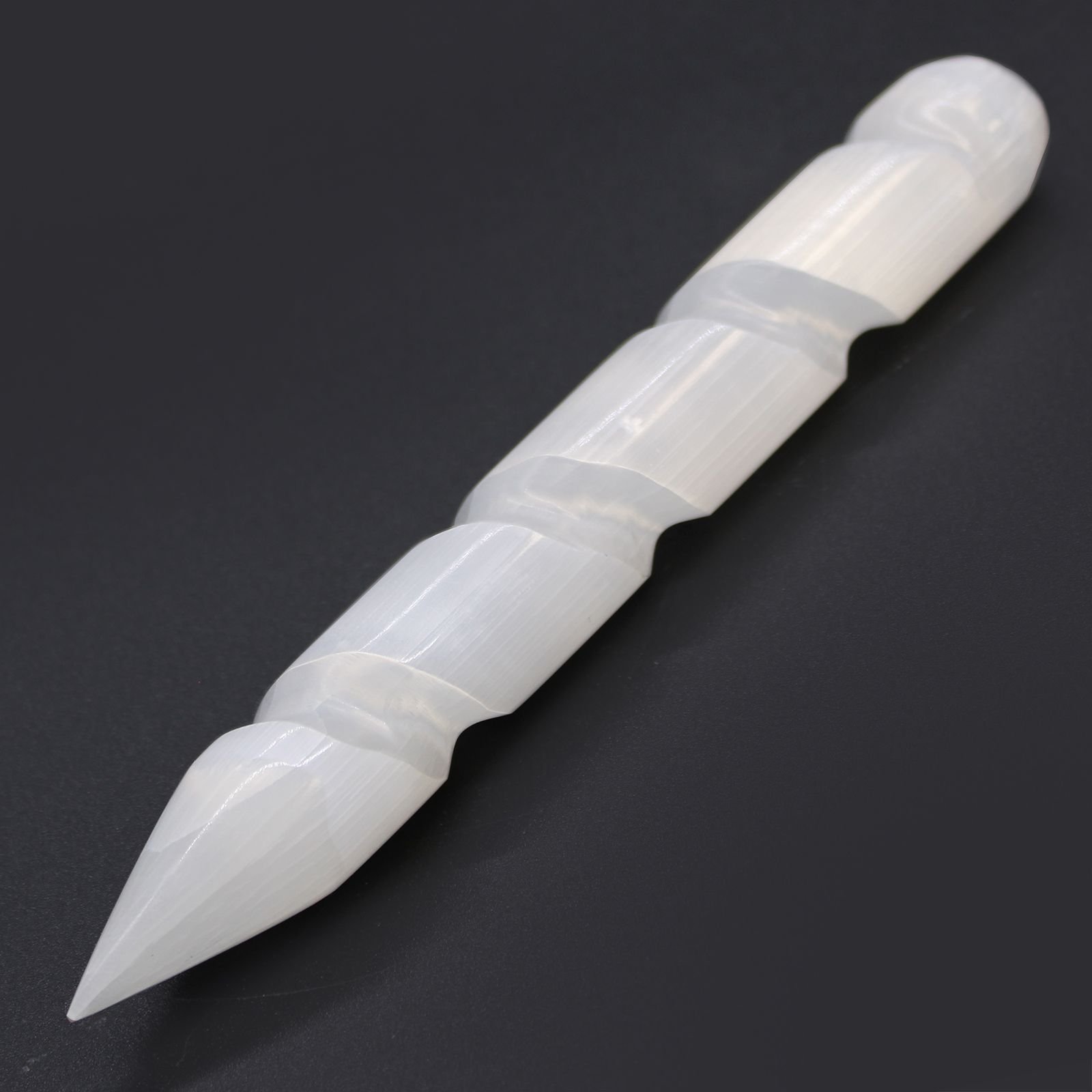 Selenite Spiral Wands – 16 cm (Point One Ends) from the mountains of Morocco. The crystal received its name from the Greek goddess of the moon: Selene – and you can see why.. the way the milky crystals refract light is totally lunar.