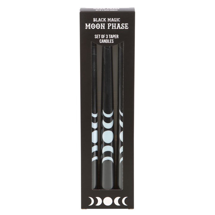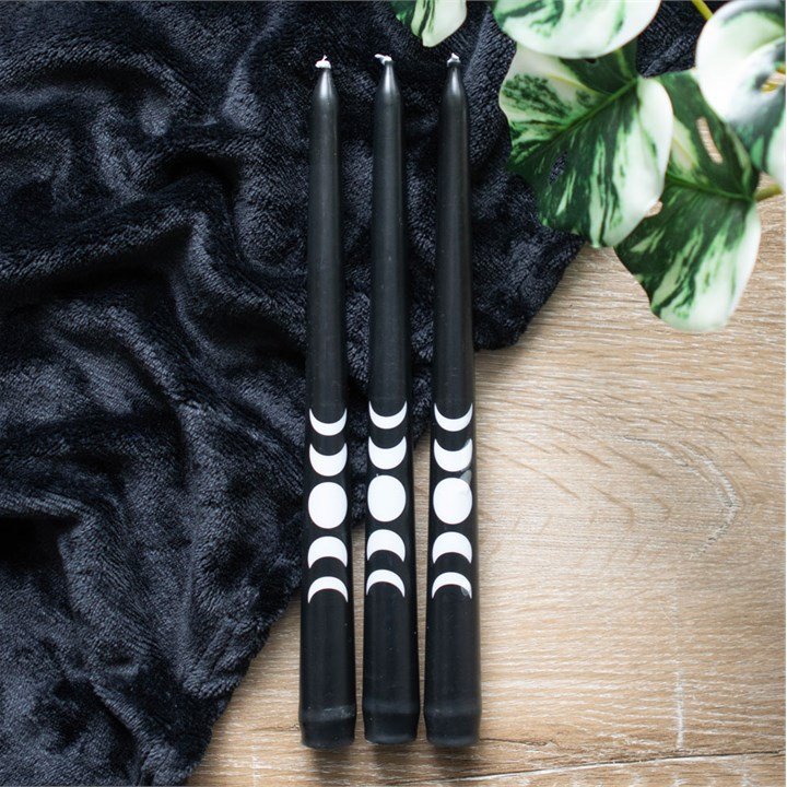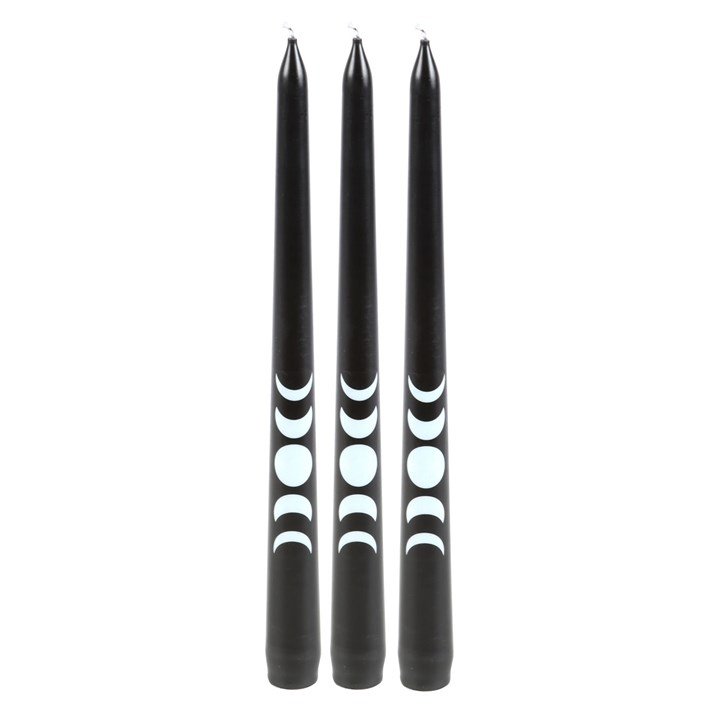 This pack of 3 black taper candles are perfect for adding final finishing touches to a table setting or adding decorative accents around the home. Adorned with a mystical moon phase design, the candles offer the perfect blend of elegance and celestial symbolism and are a must-have for anyone seeking to add a unique touch to their living space.