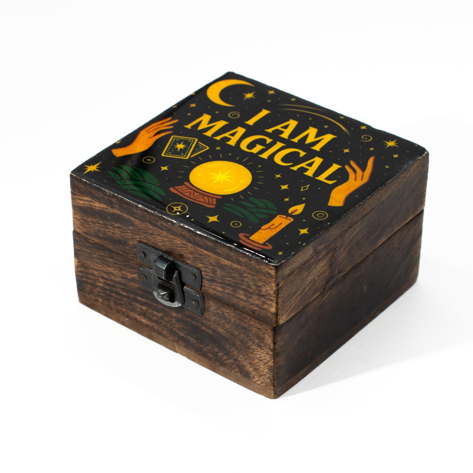This small mango wood box is a quiet reminder of inner power and intuition. The enamelled lid features the I Am Magical design, filled with symbols of tarot cards, a crystal ball, candlelight, and guiding hands, all set beneath a starry night sky.