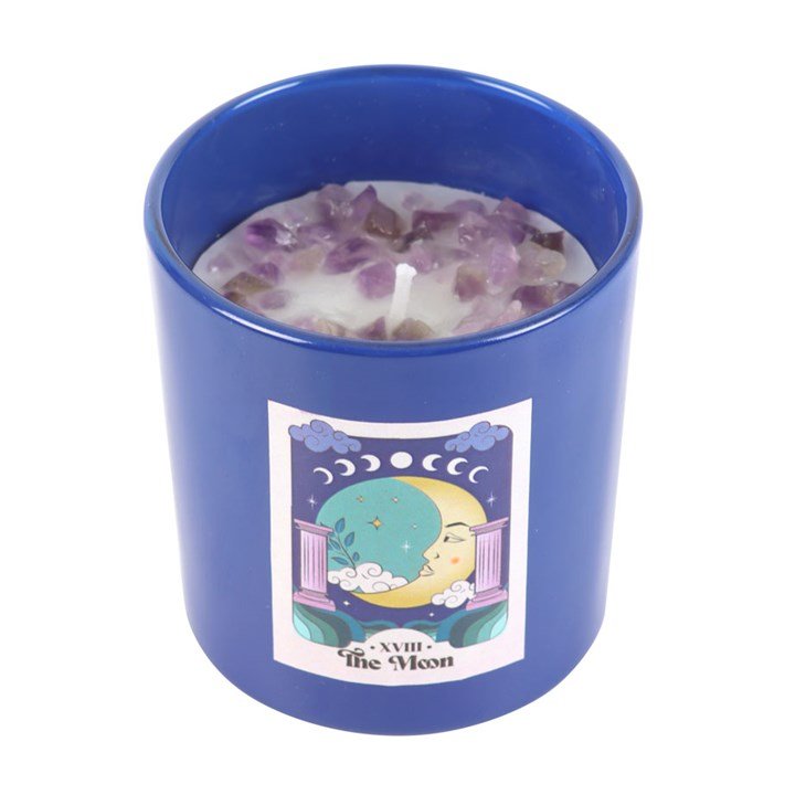 Relax and unwind with this violet fragranced candle inspired by ‘The Moon’ tarot card. This modern design features a blue glass holder accented by a scattering of amethyst crystal chips that can later be reused for a multitude of spiritual purposes. Acting as a natural tranquilizer, these amethyst chips will relieve stress, strain and anxiety. Paraffin wax. Crystals will release from wax with use. Approximate burn time of 25 hours. Please practice caution when burning and never leave lit candle unattended.