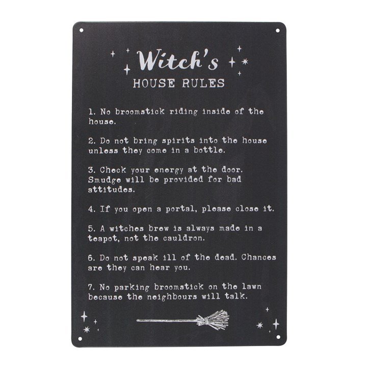 Decorative metal ‘Witch’s House Rules’ sign which is a must-have accessory for any magical household. Product Dimensions: H30cm x W20cm x D0.2cm Packaged Dimensions: H30cm x W20cm x D0.2cm